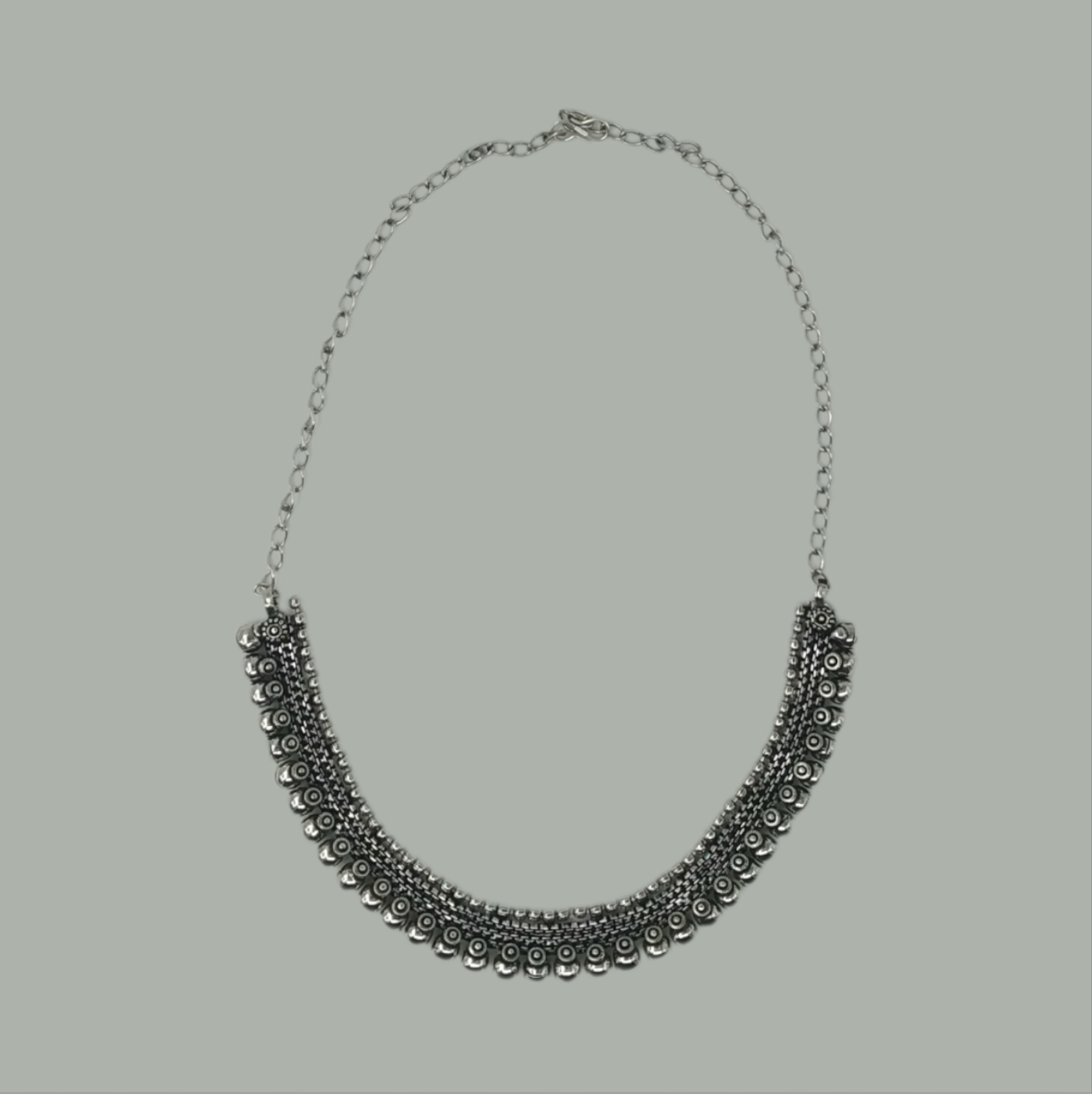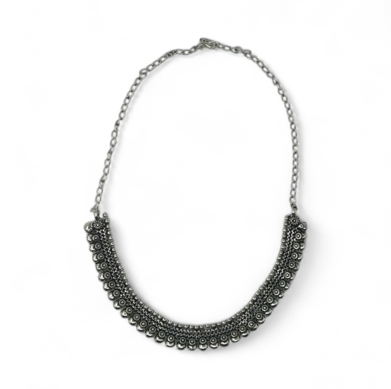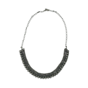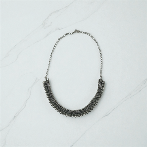 The collar is crafted from several rows of intricately textured metalwork, creating a dark and detailed look. Its bottom edge is beautifully embellished with a fringe of small, domed metal beads, adding volume and a slight jingle effect. This piece embodies a bold, ethnic-bohemian aesthetic