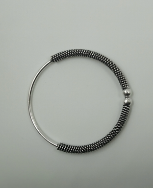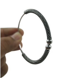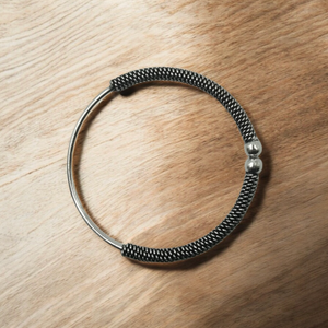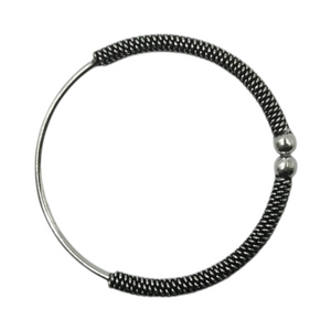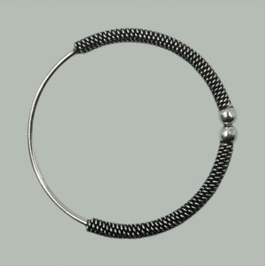 This stunning Oxidized Silver Coil Bangle is a unique fusion of bohemian and minimalist styles. The bracelet features an intricate wire-wrapped coil design in a dark, textured finish, contrasted beautifully with the smooth silver wire frame. Two small, polished silver beads sit centrally as elegant accents. It's a versatile piece, perfect for adding a touch of bold, artistic texture to any outfit, whether worn alone or stacked.