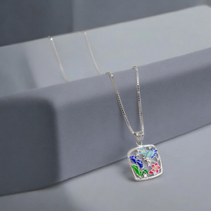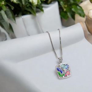 This captivating Hummingbird Blossom Pendant features a delicate silver-tone box chain and a square, open-frame charm.