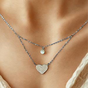 The shorter chain is adorned with a single, creamy faux pearl drop, providing a soft, classic contrast. The longer chain showcases a charming heart pendant completely covered in brilliant micro-pavé cubic zirconia stones. This piece offers effortless style and sparkling sophistication, perfect for layering or wearing solo.