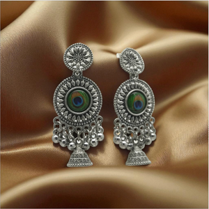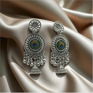Embrace a timeless ethnic elegance with our Oxidized Silver Peacock Jhumka Earrings. These handcrafted earrings feature a unique peacock eye design at the stud, symbolizing beauty and grace. The intricate oxidized silver finish gives them a vintage, rustic appeal, while the classic jhumka silhouette is adorned with small, dangling pearls that add movement and sophistication. Light enough for comfortable all-day wear, these earrings are a perfect accessory for saris, lehengas, and other traditional Indian attire.