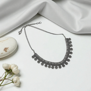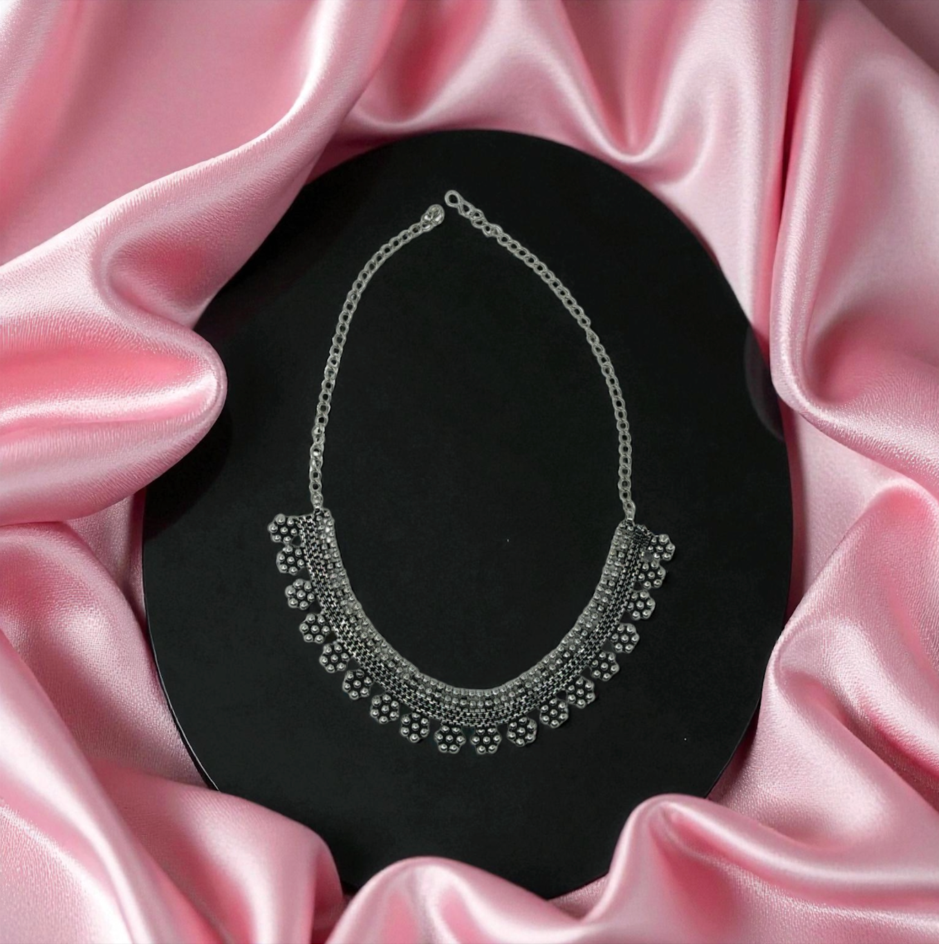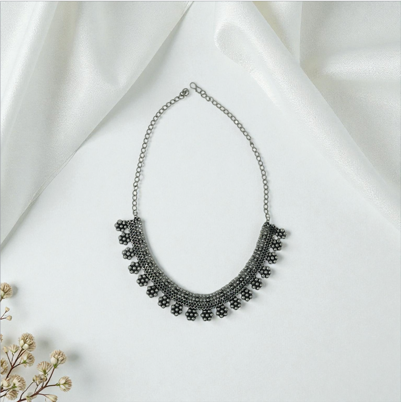 It showcases a central band composed of finely linked chains and textured metalwork, creating a dark, dramatic look. The lower edge is adorned with a fringe of stylized floral or dot-like elements, adding texture and vintage charm. It sits elegantly as a choker, perfect for pairing with a simple neckline to emphasize its bold, ethnic-inspired aesthetic.