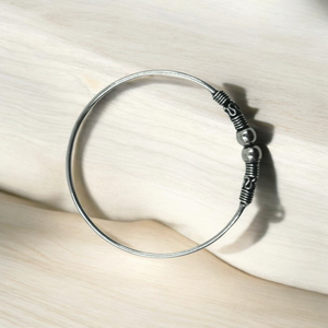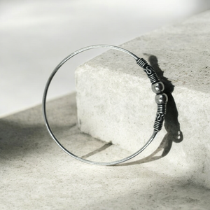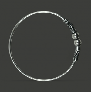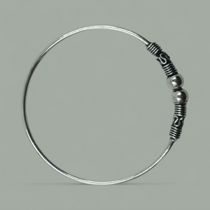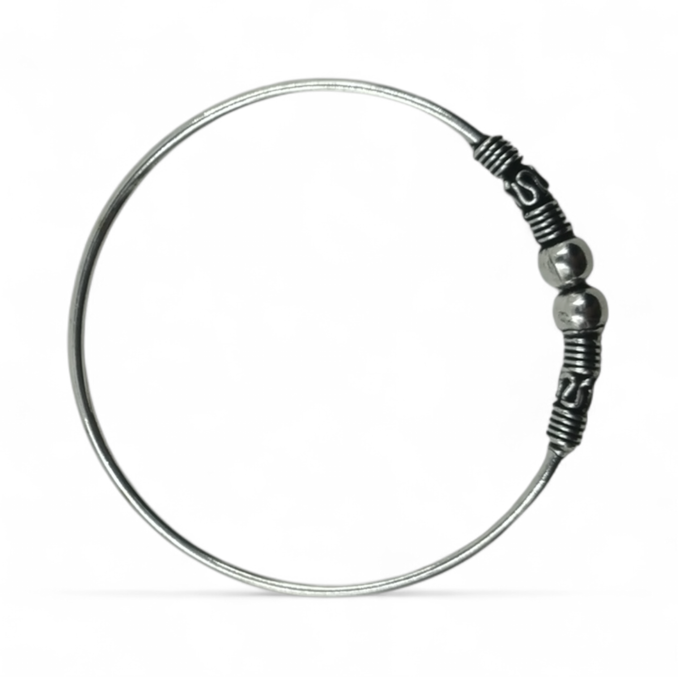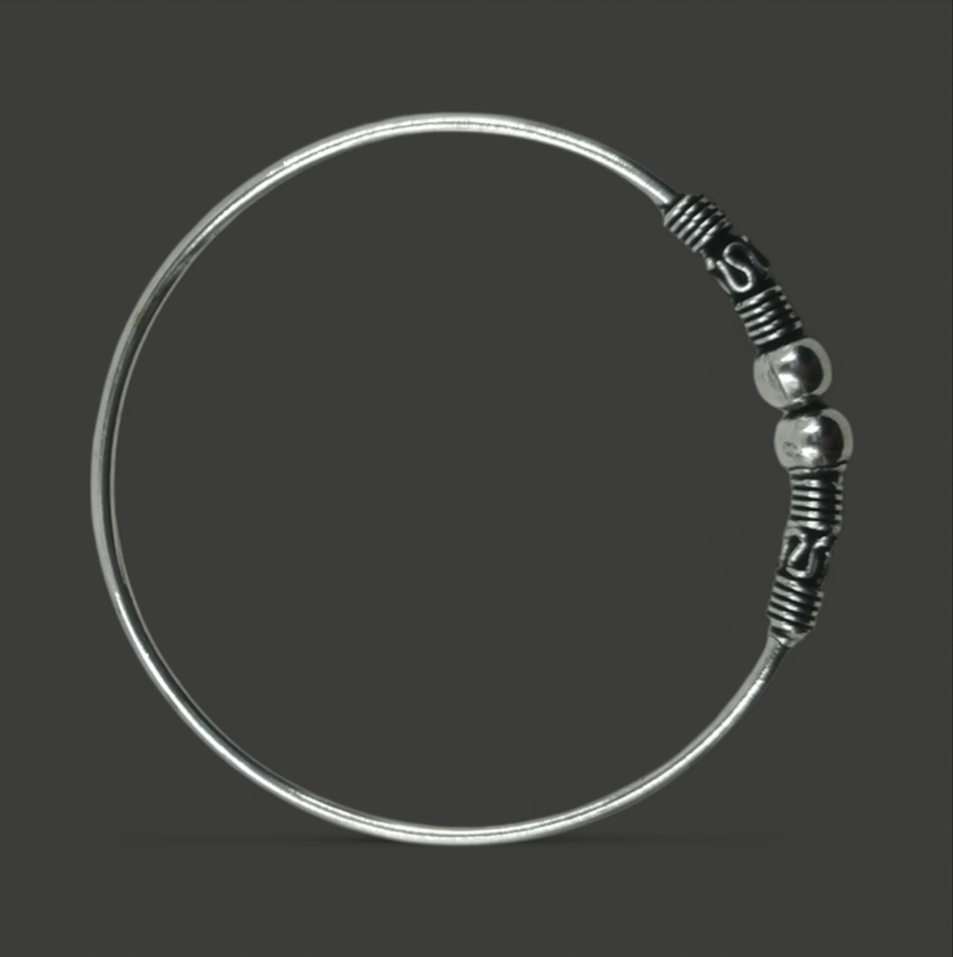 A versatile open-hoop nose ring crafted from a smooth, continuous wire. The ends showcase a detailed oxidized texture with decorative wire wrapping and two polished beads. Its simple yet striking design makes it ideal for daily wear or to add a touch of ethnic flair to any look
